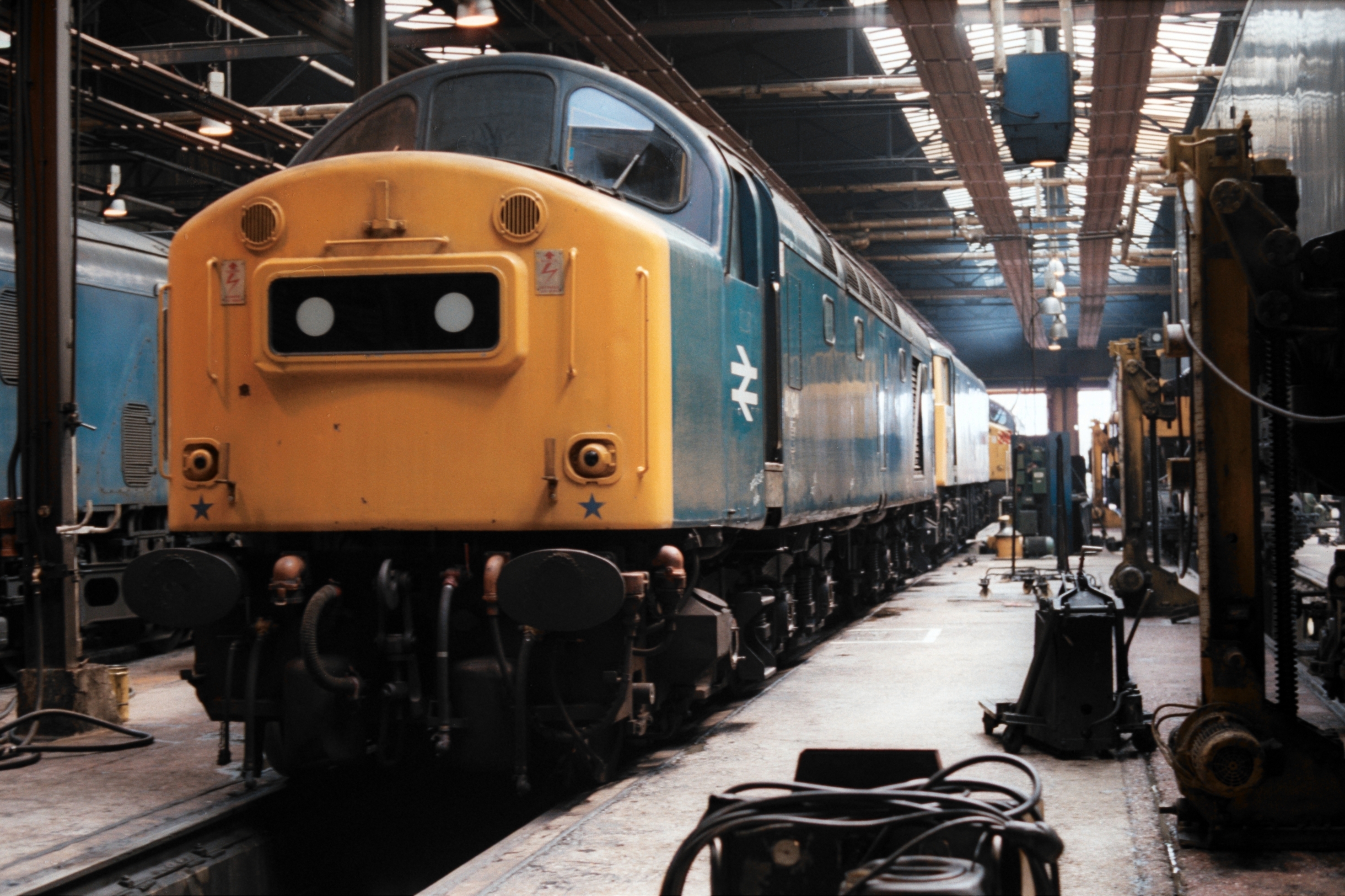 40194 inside Crewe diesel depot on 21 May 1983. Also there are 81005, 40191 and 25064.